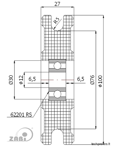 | Ratuko diametras, mm | Ašies diametras, mm | Plotis, mm | Spindulys, mm | Plotis per stebulę, mm | Atlaikoma apkrova, kg |