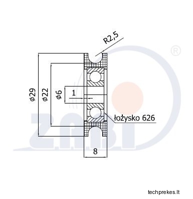 ↵Plastikinis ratukas su guoliu, skirtas trosui, lynui, virvei