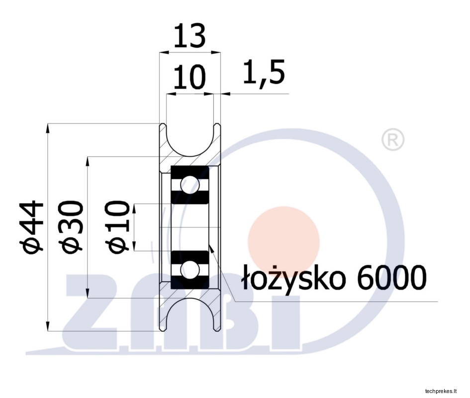 44 mm diametro metalinis ratukas su guoliu (10 mm trosui)