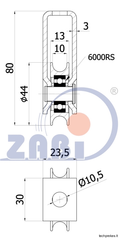 44 mm diametro metalinis ratukas su guoliu ir fiksuotu kronšteinu (10 mm trosui)