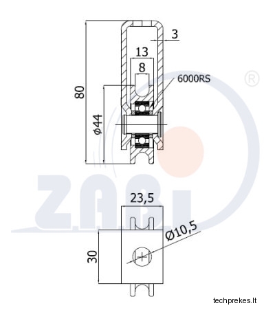 44 mm diametro metalinis ratukas su guoliu ir fiksuotu kronšteinu (8 mm trosui)