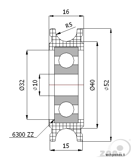 52 mm diametro plastikinis ratukas su guoliu (10 mm trosui)
