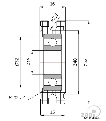 | Ratuko diametras, mm | Ašies diametras, mm | Plotis, mm | Spindulys, mm | Plotis per stebulę, mm | Atlaikoma apkrova, kg |