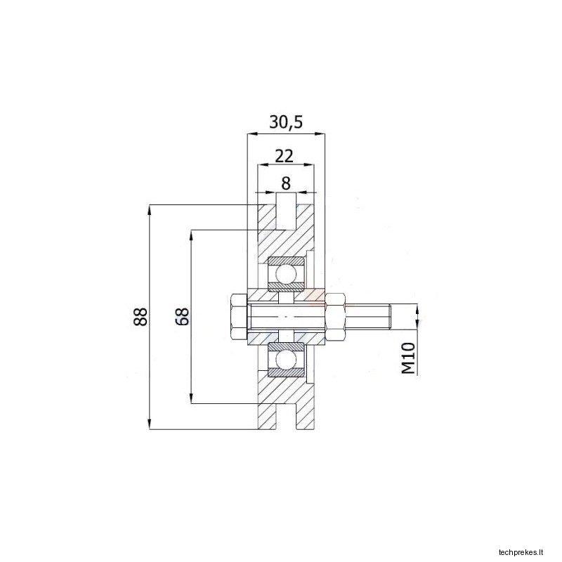 | Ratuko diametras, mm | Ašies diametras, mm | Plotis, mm | Išpjovimas, mm | Plotis per stebulę, mm | Atlaikoma apkrova, kg |