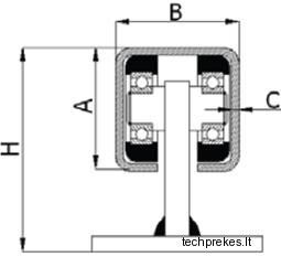 | Ratukų su guoliai tipas | Aukštis H, mm | A, mm | B, mm | C, mm | Spaudimo jėga veikianti vežimėlį, kg |