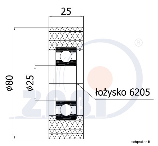 Plastikinis 80 mm diametro ratukas su guoliu (25 mm ašis)