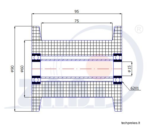 Plastikinis profiliuotas 90 mm diametro ratukas su 2 guoliais (išpjovimo plotis 75 mm)