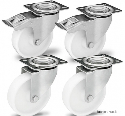 Poliamidinių 125 mm diametro ratukų komplektas su nerūdijančio plieno kronšteinais (2 pasukami ir 2 pasukami su stabdžiais) (300 kg)