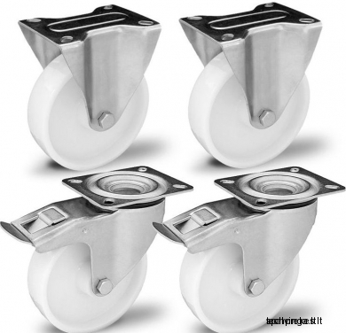 Poliamidinių 125 mm diametro ratukų komplektas su nerūdijančio plieno kronšteinais (2 pasukami su stabdžiais ir 2 fiksuoti) (300 kg)