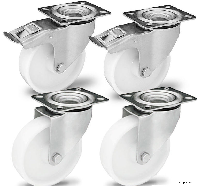 Poliamidinių 80 mm diametro ratukų komplektas su nerūdijančio plieno kronšteinais (2 pasukami ir 2 pasukami su stabdžiais) (240 kg)