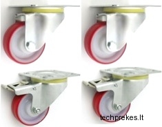 Poliamidinių, padengtų poliuretaniniu sluoksniu 100 mm diametro ratukų komplektas su nerūdijančio plieno kronšteinais (2 pasukami ir 2 pasukami su stabdžiais) (300 kg)