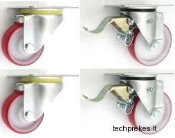 Poliamidinių, padengtų poliuretaniniu sluoksniu 125 mm diametro ratukų komplektas su nerūdijančio plieno kronšteinais (2 pasukami ir 2 pasukami su stabdžiais) (300 kg)